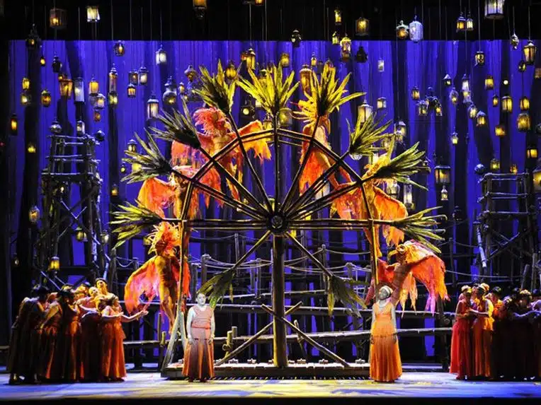 Décor composé principalement de 2 tableaux. Le premier tableau représente la jungle avec passerelles et miradors en bois; il est illuminé par des